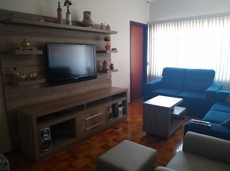 👉Armários embutidos nos quartos, cozinha planejada, painel de TV na sala.
