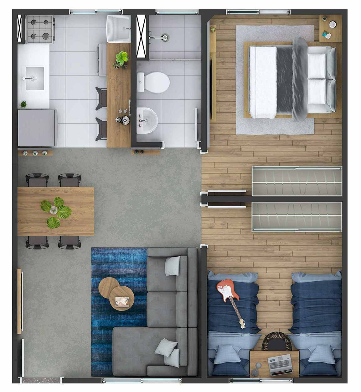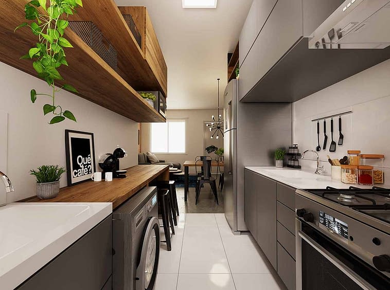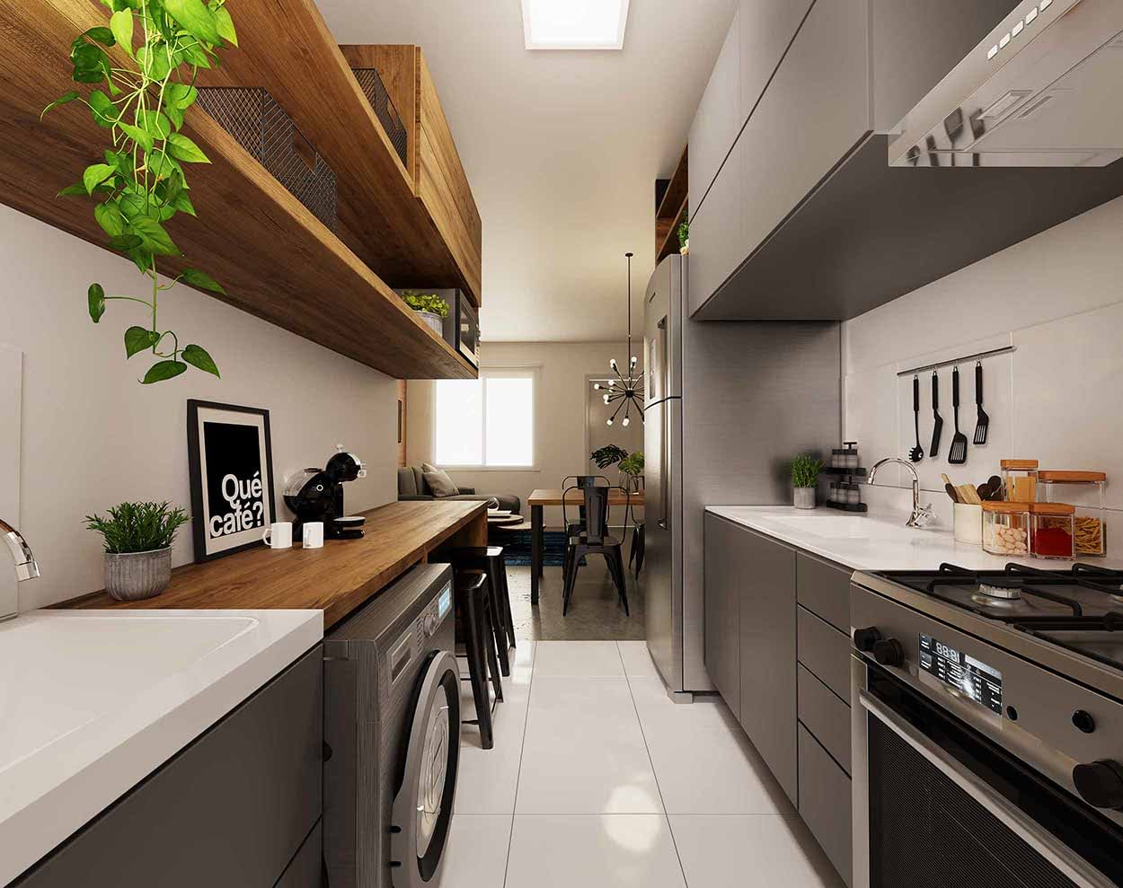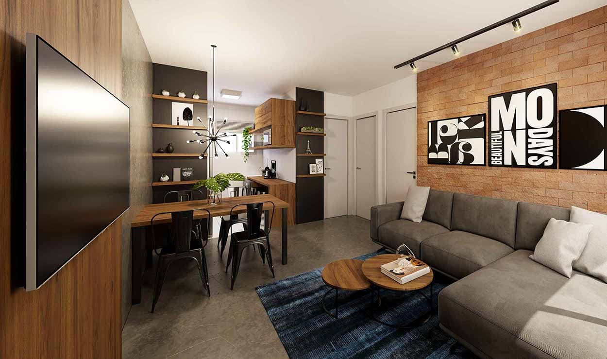 Apartamento com 2 dormitórios, 1 banheiro, cozinha, área de serviço, salas de estar e jantar conjugadas.